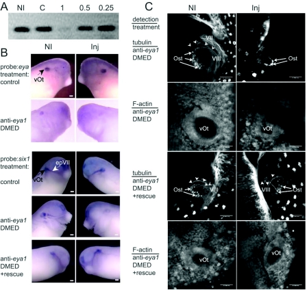Figure 4. Oligonucleotide-mediated loss of eya1 and rescue by injection of eya1 mRNA(A) DMED-modified oligonucleotides complementary to Xenopus eya1 reduce the levels of eya1 mRNA. Eya1 mRNA was assayed from non-injected embryos (NI), embryos injected with 1 ng of a control oligonucleotide (C) or 1, 0.5 or 0.25 ng of anti-eya1 oligonucleotide. (B) Injection of 1 ng of anti-eya1 oligonucleotide into one side of the embryo reduces the level of endogenous eya1 and six1 mRNAs shown by in situ hybridization. (C) Reduction of eya1 correlates with inability to form a proper otocyst, as assayed by whole mount immunohistochemical detection of tubulin and F-actin by confocal microscopy along the dorsal–lateral plane. Both six1 expression and normal otocyst formation are rescued by co-injection of oligonucleotide with 250 pg of rescue mRNA encoding T7–eya1 protein. The otic vesicle (vOt) and facial epibranchial placode (epVII) are identified in (B). In (C), otic sensory tissue (Ost), cranial nerves (V, VII and VIII) and neurites leading to the VIII nerve (arrowheads) are labelled. Scale bars on in situ hybridization images, 200 μm; scale bars on confocal images, 50 μm. Inj. injected. |