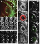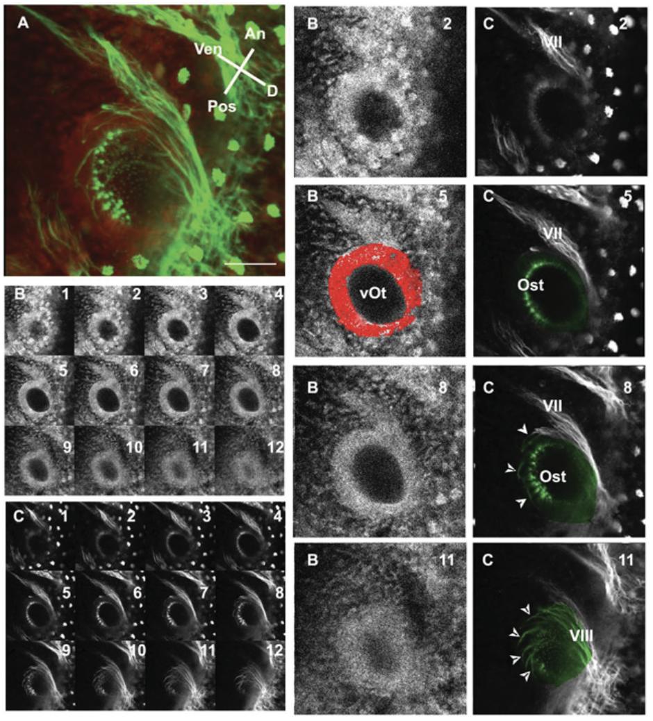 Images were captured starting from the left lateral side of the embryo and then moving medially. (A) A composite of stacks (B) and (C). (B) Each image of a confocal stack using phalloidin as a stain. (C) Each image of a confocal stack detecting acetylated α-tubulin. Enlargements of companion images show how phalloidin staining highlights the otocyst and allows an easy estimate of otic vesicle (vOt) size. The otic vesicle is coloured red in B 5. The appearance of sensory tissue in the otocyst (Ost) can be seen in C 5 and C 8 by reactivity to the anti-tubulin antibody and are selectively coloured green. In C 11 the neurites (arrowheads) connecting the VIII cranial nerve with the otocyst on the ventral medial side are coloured green. Scale bar in (A), 50 μm. An, anterior; D, dorsal; Pos, posterior; V, ventral; VII, VII cranial nerve. |