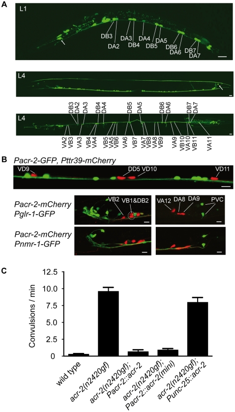 In the nematode Caenorhabditis elegans, cholinergic motor neurons stimulate muscle contraction as well as activate GABAergic motor neurons that inhibit contraction of the contralateral muscles. Here, we describe the composition of an ionotropic acetylcholine receptor that is required to maintain excitation of the cholinergic motor neurons. We identified a gain-of-function mutation that leads to spontaneous muscle convulsions. The mutation is in the pore domain of the ACR-2 acetylcholine receptor subunit and is identical to a hyperactivating mutation in the muscle receptor of patients with myasthenia gravis. Screens for suppressors of the convulsion phenotype led to the identification of other receptor subunits. Cell-specific rescue experiments indicate that these subunits function in the cholinergic motor neurons. Expression of these subunits in Xenopus oocytes demonstrates that the functional receptor is comprised of three alpha-subunits, UNC-38, UNC-63 and ACR-12, and two non-alpha-subunits, ACR-2 and ACR-3. Although this receptor exhibits a partially overlapping subunit composition with the C. elegans muscle acetylcholine receptor, it shows distinct pharmacology. Recordings from intact animals demonstrate that loss-of-function mutations in acr-2 reduce the excitability of the cholinergic motor neurons. By contrast, the acr-2(gf) mutation leads to a hyperactivation of cholinergic motor neurons and an inactivation of downstream GABAergic motor neurons in a calcium dependent manner. Presumably, this imbalance between excitatory and inhibitory input into muscles leads to convulsions. These data indicate that the ACR-2 receptor is important for the coordinated excitation and inhibition of body muscles underlying sinusoidal movement.