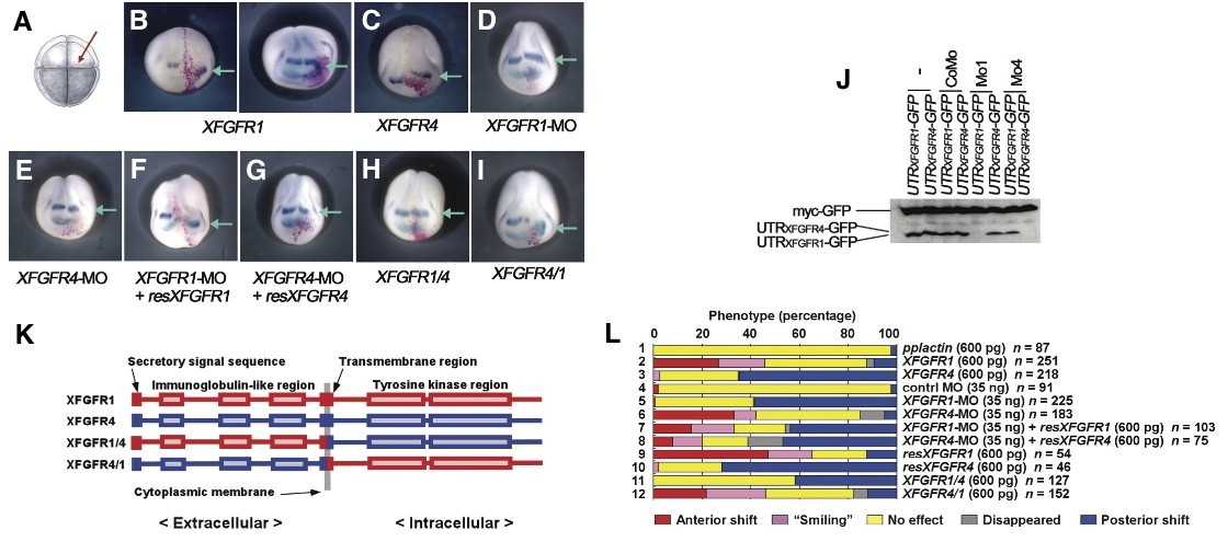 Fig. 2. Expression levels of XFGFR1 and XFGFR4 are important for normal development of the anterior neural region. (A) The site of microinjection at the 8-cell stage (animal view with dorsal side up) is indicated by the red arrow. (B-I) The embryos were examined for Xpax2 expression (blue) and β-galactosidase activity (red on the injected side). Green arrows indicate Xpax2 expression on the injected side. Xpax2 expression is shifted anteriorly by XFGFR1 mRNA (B left) and XFGFR4-MO (E), and posteriorly by XFGFR4 mRNA (C) and XFGFR1-MO (D). Some of the XFGFR1 mRNA- injected embryos exhibited a miling phenotype(B right). The phenotypes induced by MOs were reversed by the rescue constructs, resXFGFR1 mRNA (F) and resXFGFR4 mRNA (G). The directions of the shifts are determined by the ICDs, as shown by injecting XFGFR1/4 (H) and XFGFR4/1 (I) mRNAs. (J) MO-mediated translational inhibition. UTRXFGFR1-GFP and UTRXFGFR4-GFP are the 5untranslated regions of XFGFR1 (plus the first 4 codons) and XFGFR4 (plus the first 8 codons) fused to GFP, respectively. Whole lysates from stage-11 embryos injected with mRNA (500 pg) and MO (35 ng) were analyzed by western blotting for GFP. myc-GFP mRNA was injected as an injection control. (K) Structures of the wild-type and chimeric XFGFRs. The regions of XFGFR1 and XFGFR4 are shown in red and blue, respectively. (L) Summary of injections. Preprolactin (pplactin) mRNA was injected as a control RNA.