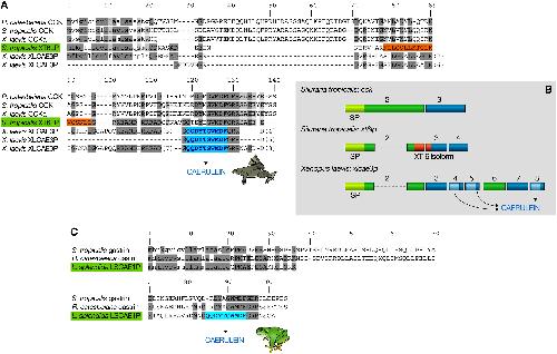 The newly identified precursors are labeled in lime green. In (A) and (C), amino acid residues are highlighted as follows: dark gray, shared between caerulein precursors and others; light gray, shared between XT6LP and CCK precursors; orange, XT-6 isoform; blue, caerulein peptides. Predicted signal peptides are printed in lowercase. In (B), homologous exons and peptide regions are shown in the same color scheme. SP indicates signal peptide.