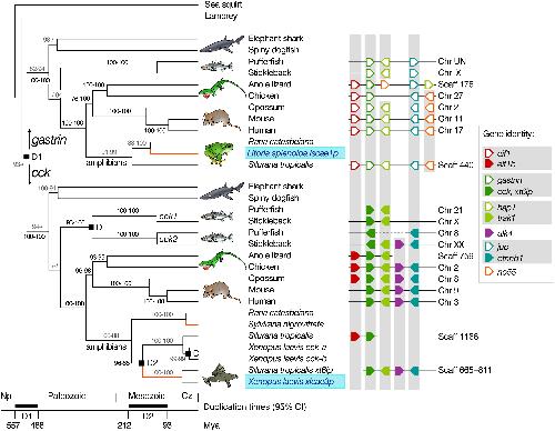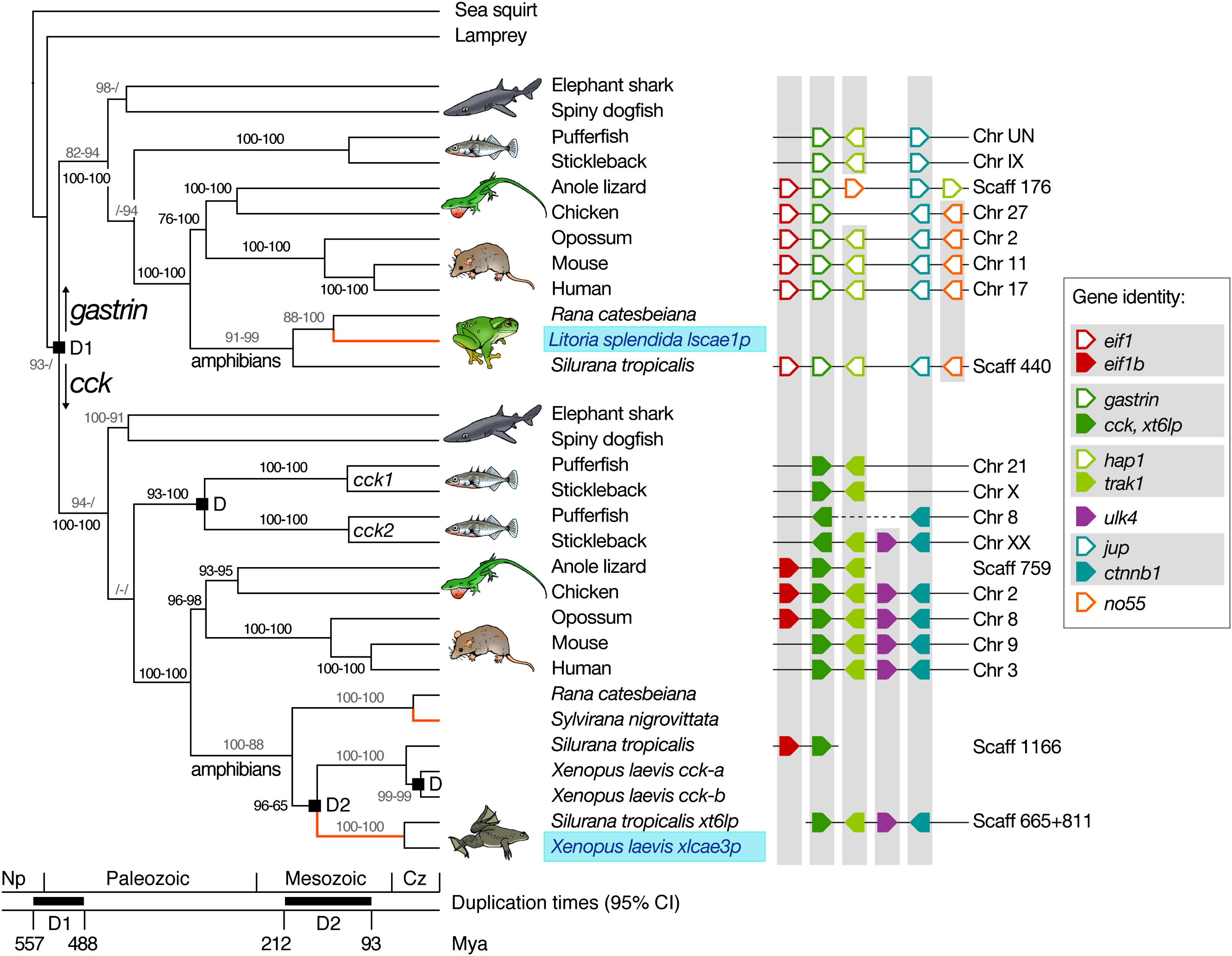 Left: parallel origins of caerulein are indicated in light blue. Inferred duplication events are labeled “D.” Branch labels represent bootstrap percentages obtained by maximum parsimony (left) and maximum likelihood (right); values < 50% are indicated by a slash (/). Gray and black bootstrap percentages are calculated from data sets 1 and 2, respectively (see Results). The phylogeny is time calibrated with a Bayesian relaxed-clock model and priors for vertebrate divergence times derived from the fossil record and molecular studies (see Supplemental Experimental Procedures). Black horizontal bars in the timescale represent 95% credibility intervals for two relevant duplication events (nodes D1 and D2). Branches along which skin expression evolved are indicated in orange. Right: cck and gastrin genes of various vertebrates and xt6lp of S. tropicalis (filled and empty dark green symbols in the synteny maps) are flanked by homologous gene pairs (vertically aligned filled and empty symbols; see gene identity legend for color code), providing evidence for a segmental duplication (node D1) in the ancestor of jawed vertebrates. Depicted genes were included in data set 2. The following abbreviations are used: Np, Neoproterozoic; Cz, Cenozoic; CI, credibility interval; Mya, million years ago; Chr, chromosome; Scaff, scaffold.