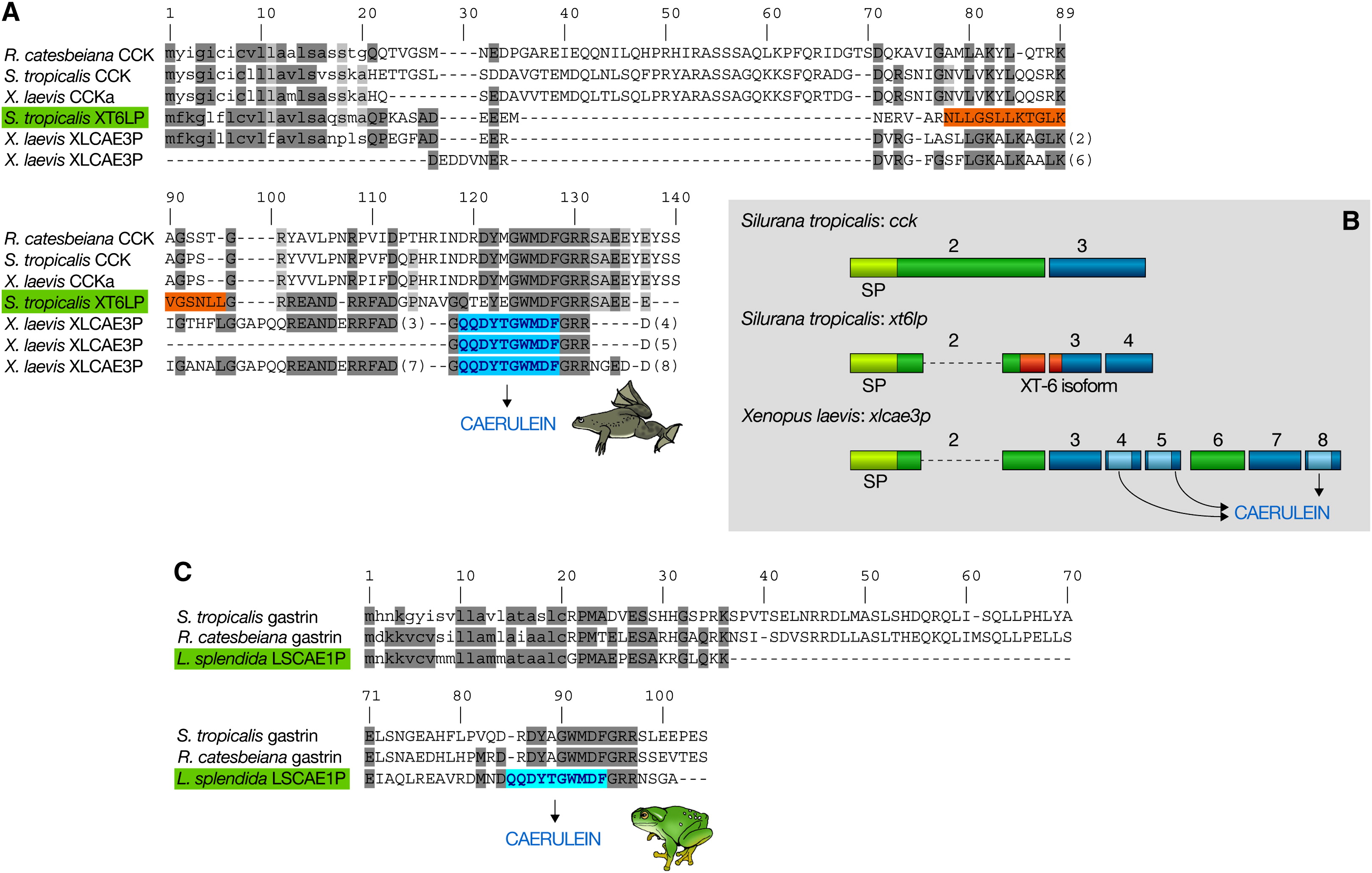 (A) Amino acid sequence alignment of the S. tropicalis XT-6 like precursor (XT6LP) with amphibian CCK precursors and an X. laevis caerulein precursor (XLCAE3P). The sequence of XLCAE3P occupies multiple lines because duplicated exons were aligned to each other. Numbers in parentheses indicate XLCAE3LP exon ends.