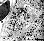 The melanotrope cell in the amphibian pituitary pars intermedia is a model to study fundamental aspects of neuroendocrine integration. They release alpha-melanophore-stimulating hormone (alphaMSH), under the control of a large number of neurochemical signals derived from various brain centers. In Xenopus laevis, most of these signals are produced in the hypothalamic magnocellular nucleus (Mg) and are probably released from neurohemal axon terminals in the pituitary neural lobe, to stimulate alphaMSH-release, causing skin darkening. The presence in the neural lobe of at least eight stimulatory factors implicated in melanotrope cell control has led us to investigate the ultrastructural architecture of this neurohemal organ, with particular attention to the diversity of neurohemal axon terminals and their neurochemical contents. Using regular electron microscopy, we here distinguish six types of neurohemal axon terminal, on the basis of the size, shape and electron-density of their secretory granule contents. Subsequently, we have identified the neurochemical contents of these terminal types by immuno-electron microscopy and antisera raised against not only the 'classical' neurohormones vasotocin and mesotocin but also brain-derived neurotrophic factor, cocaine- and amphetamine-regulated transcript peptide, corticotropin-releasing factor, metenkephalin, pituitary adenylyl cyclase-activating polypeptide, thyrotropin-releasing hormone and urocortin-1. This has revealed that each terminal type possesses a unique set of neurochemical messengers, containing at least four, but in some cases up to eight messengers. These results reveal the potential of the Mg/neural lobe system to release a wide variety of neurochemical messengers in a partly co-ordinated and partly differential way to control melanotrope cell activity as well as ion and water balance regulatory organs, in response to various, continuously changing, environmental stimuli.