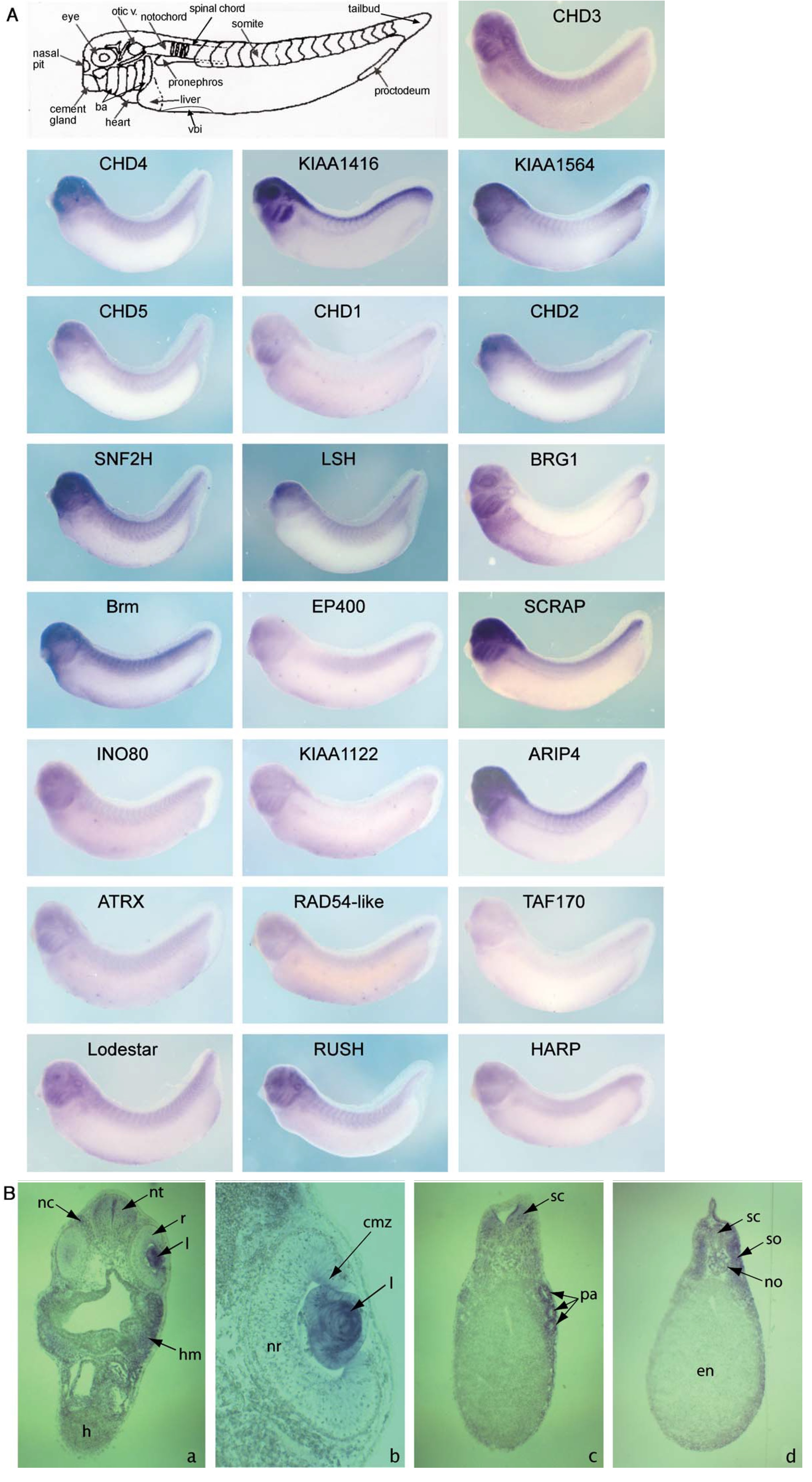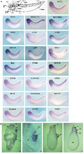 Fig. 3. Expression patterns of Xenopus SNF2-domain proteins. (A) Top left shows a cartoon of a Xenopus embryo at the tailbud stage. Relevant tissues are