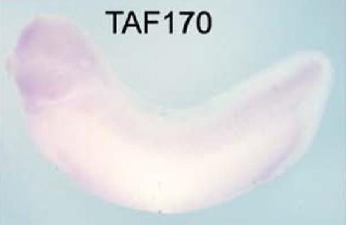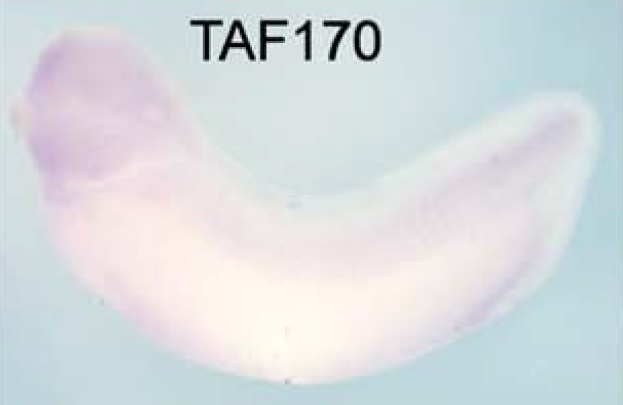 btaf1 (B-TFIID TATA-box binding protein associated factor 1) gene expression in Xenopus laevis embryo, assayed via in situ hybridization, NF stage 28, lateral view, anterior left, dorsal up. |