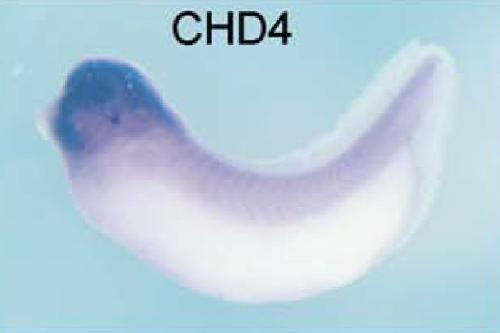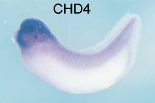 chd4 (chromodomain helicase DNA binding protein 4) gene expression in Xenopus laevis embryo, assayed via in situ hybridization, NF stage 28, lateral view, anterior left, dorsal up. |