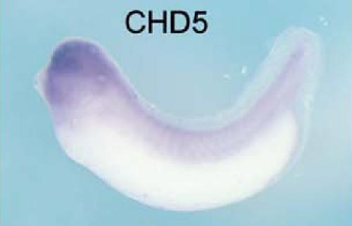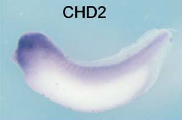 chd2 (chromodomain helicase DNA binding protein 2) gene expression in Xenopus laevis embryo, assayed via in situ hybridization, NF stage 28, lateral view, anterior left, dorsal up. |