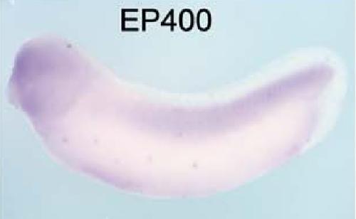 ep400 (E1A binding protein p400) gene expression in Xenopus laevis embryo, assayed via in situ hybridization, NF stage 28, lateral view, anterior left, dorsal up. |