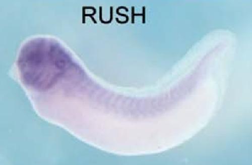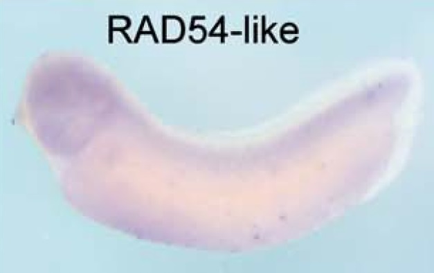 rad54l2 (RAD54-like 2) gene expression in Xenopus laevis embryo, assayed via in situ hybridization, NF stage 28, lateral view, anterior left, dorsal up. |