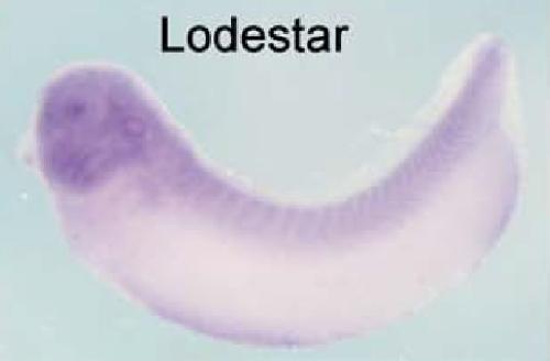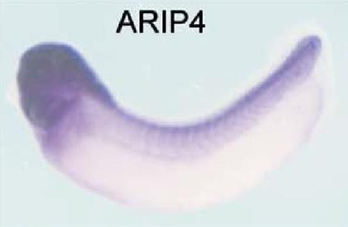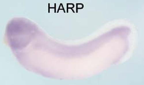 smarcal1 (SWI/SNF related, matrix associated, actin dependent regulator of chromatin, subfamily a-like 1) gene expression in Xenopus laevis embryo, assayed via in situ hybridization, NF stage 28, lateral view, anterior left, dorsal up. |