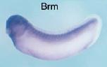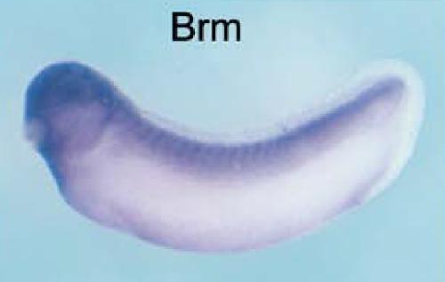 the proliferative ciliary marginal zone (cmz) and lens; Brm is not expressed in differentiated retinal cells (nr). Panel c shows a section of the anterior trunk with