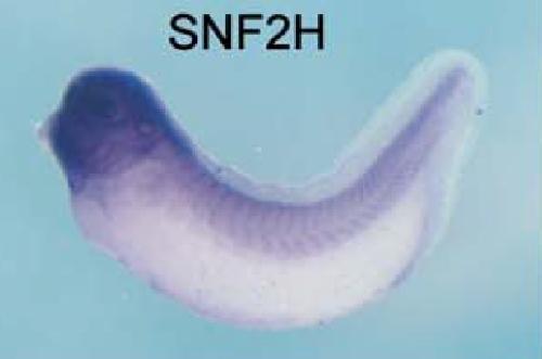 smarca5 (SWI/SNF related, matrix associated, actin dependent regulator of chromatin, subfamily a, member 5) gene expression in Xenopus laevis embryo, assayed via in situ hybridization, NF stage 35, lateral view, anterior left, dorsal up. |