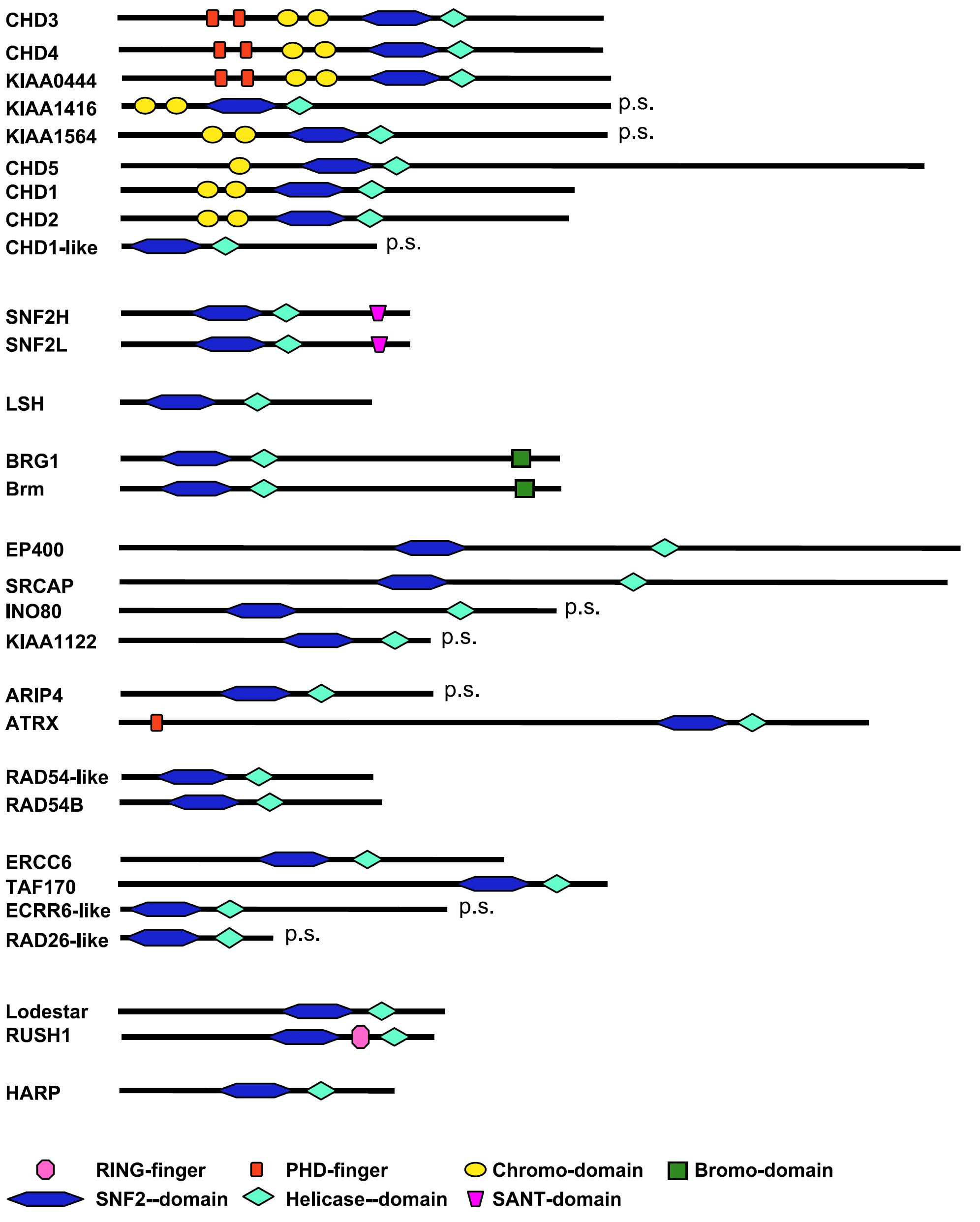 Fig. 1. Overview of the human SNF2-domain family of ATPases. The cartoons of SNF2-domain members represent in each case the longest single database
