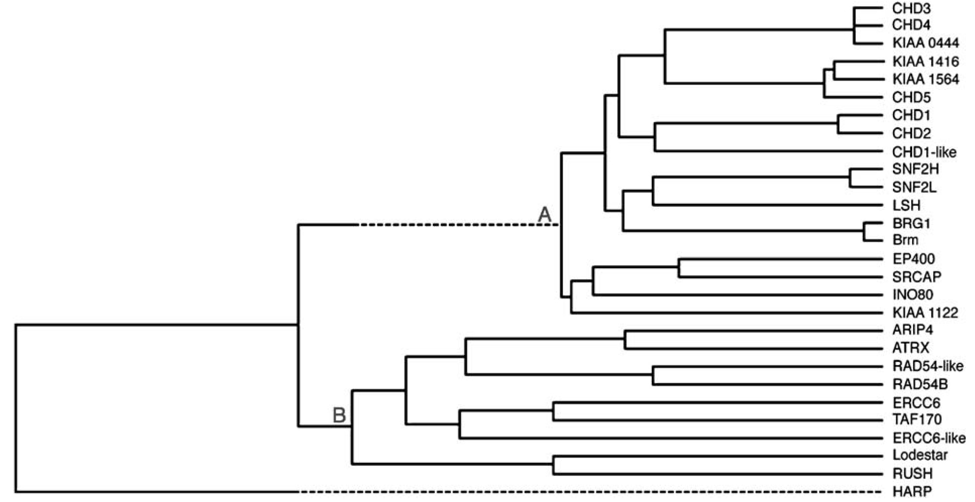 Fig. 2. Sequence similarity tree of the human SNF2-domain containing proteins. The amino acid sequences comprising of the SNF2-domains of the human