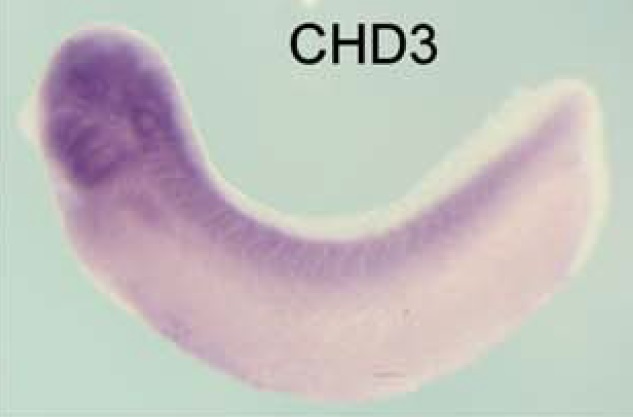 chd3 (chromodomain helicase DNA binding protein 3) gene expression in Xenopus laevis embryo, assayed via in situ hybridization, NF stage 28, lateral view, anterior left, dorsal up. |