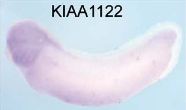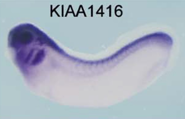 chd7 (chromodomain helicase DNA binding protein 7) gene expression in Xenopus laevis embryo, assayed via in situ hybridization, NF stage 28, lateral view, anterior left, dorsal up. |