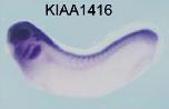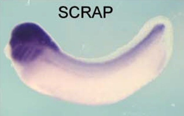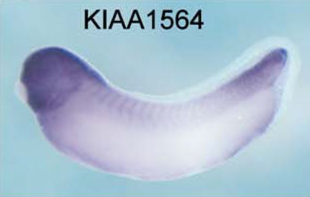 srcap (Snf2-related CREBBP activator protein) gene expression in Xenopus laevis embryo, assayed via in situ hybridization, NF stage 28, lateral view, anterior left, dorsal up. |