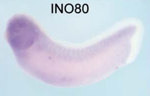 ino80 (INO80 complex ATPase subunit) gene expression in Xenopus laevis embryo, assayed via in situ hybridization, NF stage 28, lateral view, anterior left, dorsal up. |