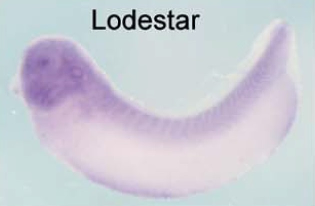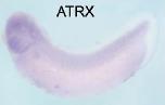 atrx (alpha thalassemia/mental retardation syndrome X-linked) gene expression in Xenopus laevis embryo, assayed via in situ hybridization, NF stage 28, lateral view, anterior left, dorsal up. |