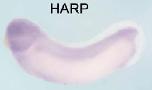 (nc), lens (l) and the head mesoderm (hm) and to a lower extend in th retina (r), but not in heart (h). Panel b shows a blow up of the eye with specific staining in