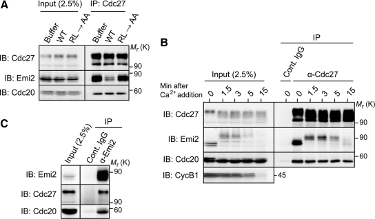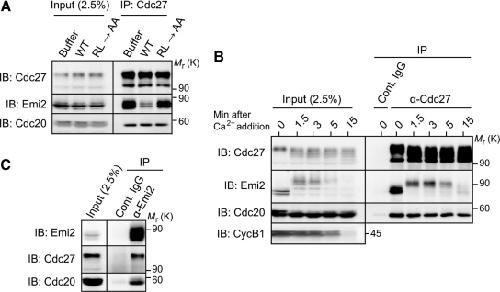 Figure 3. Binding of the Emi2 RL motif to the APC/C at a site(s) distinct from that occupied by the Cdc20 IR domain. (A) CSF extracts were incubated with an excess (2 mM) of the indicated C-terminal RL motif peptides for 5 min and subjected to Cdc27 immunoprecipitation followed by Emi2 or Cdc20 immunoblotting. (B) CSF extracts were treated with calcium and then subjected to either control or Cdc27 immunoprecipitation followed by immunoblotting for the indicated proteins. On calcium treatment, Emi2 underwent hyperphosphorylation and degradation, as previously shown (Rauh et al., 2005). (C) CSF extracts were subjected to either control or Emi2 immunoprecipitation followed by immunoblotting for Cdc27 and Cdc20. The anti-Emi2 antibody used was anti-Emi2 (N-terminus) antibody, not anti-RL motif peptide antibody (which could not precipitate Cdc27 or Cdc20; data not shown, but see Figure 2F). Four, three, and four independent experiments were performed for A–C, respectively, and, for each a typical result is shown.