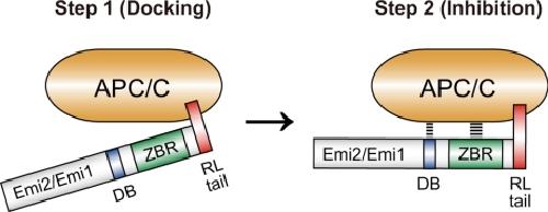 Figure 6. A two-step model for the inhibition of the APC/C by Emi1/Emi2. Emi1/Emi2 inhibit the APC/C by two steps: (1) docking onto the APC/C via the RL tail, and (2) interaction and inhibition of the APC/C by the D-box and the ZBR.