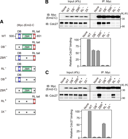 Figure 4. Comparison of the binding affinities of the D-box, the ZBR, and the RL tail to the APC/C. (A) Schematic representation of various Emi2-C constructs. Each Emi2-C construct is N-terminally tagged with three Myc-epitopes. Asterisk, Ala mutation of the essential residue(s) in the indicated motifs (see text for details). (B and C) CSF extracts were incubated with 35 ng/μl mRNA encoding the indicated (Myc-)Emi2-C constructs for 1 h and subjected to Myc immunoprecipitation followed by Cdc27 immunoblotting (top). The levels of coprecipitated Cdc27 were quantitated and normalized to (Myc-)Emi2-C proteins; the value obtained for Cdc27 coprecipitated with WT Emi2-C was set at 100, and all values are means ± SD of five independent experiments (bottom).