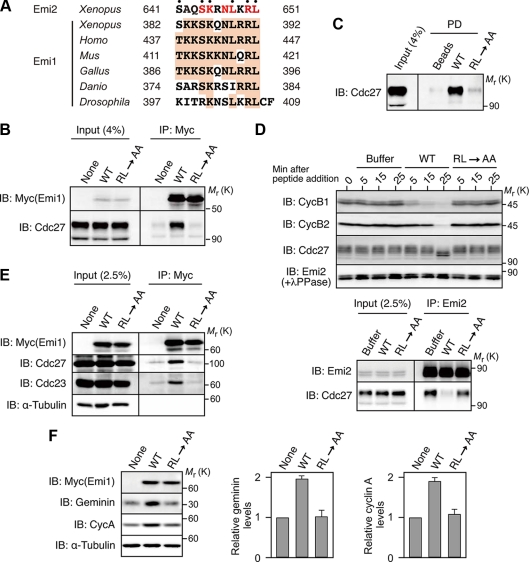 Figure 5. Binding of Emi1 to the APC/C via the RL tail. (A) Conservation of the C-terminal amino acid sequence in Emi1 proteins from various species. Emi2 (Xenopus) also has conserved amino acids (in red) at the corresponding sites of Emi1 (dotted residues are those essential for APC/C binding). (B) CSF extracts were incubated with 35 ng/μl mRNA encoding the indicated Xenopus (Myc-)Emi1 constructs (proteolysis-resistant forms; Ohsumi et al., 2004) for 2 h and subjected to Myc immunoprecipitation followed by Cdc27 immunoblotting. (C) CSF extracts were incubated with uncoupled control beads or beads coupled with the indicated Xenopus Emi1 C-terminal tail peptides (residues 379-392); the beads were then pulled down and subjected to immunoblotting for Cdc27. (D) CSF extracts were added with buffer (as control) or an excess (2 mM) of the indicated Xenopus Emi1 C-terminal peptides and subjected either to immunoblotting for the indicated proteins at the indicated times (top) or to Emi2 immunoprecipitation followed by Cdc27 immunoblotting 5 min after the peptide addition (bottom). (E) HEK293 cells were transfected with cDNA encoding the indicated human (Myc-)Emi1 constructs, cultured for 48 h, and subjected to Myc immunoprecipitation followed by immunoblotting for the indicated proteins (α-tubulin being a loading and IP control). (F) HEK293 cells transfected as in E were subjected to immunoblotting for the indicated proteins (left). The levels of geminin and cyclin A were quantitated and normalized to the level of α-tubulin; the value obtained for nontransfected cells was set at 1, and all values are means ± SD of five independent experiments (middle and right). At least three independent experiments were performed for B–E, and, for each a typical result is shown.