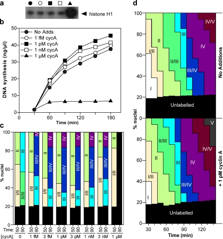 In the metazoan replication timing program, clusters of replication origins located in different subchromosomal domains fire at different times during S phase. We have used Xenopus laevis egg extracts to drive an accelerated replication timing program in mammalian nuclei. Although replicative stress caused checkpoint-induced slowing of the timing program, inhibition of checkpoint kinases in an unperturbed S phase did not accelerate it. Lowering cyclin-dependent kinase (Cdk) activity slowed both replication rate and progression through the timing program, whereas raising Cdk activity increased them. Surprisingly, modest alteration of Cdk activity changed the amount of DNA synthesized during different stages of the timing program. This was associated with a change in the number of active replication factories, whereas the distribution of origins within active factories remained relatively normal. The ability of Cdks to differentially effect replication initiation, factory activation, and progression through the timing program provides new insights into the way that chromosomal DNA replication is organized during S phase.