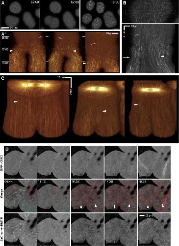 Figure 2. The furrow forms in a microtubule-poor region. (A) Single superficial confocal sections of a 16-cell sand dollar embryo, slightly compressed (EMTB-3G). (02:00) All three cells in metaphase; few microtubule ends are visible. (07:00) Left cell begins cleavage, right cell is still in metaphase, and the top cell has likely entered anaphase. (13:00) Right cell begins to cleave; fewer microtubules approach the cell surface (bright dots) in the incipient furrow than outside it. (A′) “Kymocubes” made by 3D rendering sequence in A; white lines denote frames in A. The whole of each of three cells is shown in the kymocube. Bright dots (open arrowheads in A–C) indicate brief cortical visits by microtubule ends; these predominate in metaphase. Vertical streaks (closed arrowheads in A–C) indicate kinematically stable microtubule ends, which appear before furrowing, and are scarce in the equatorial zone. (B) Kymograph of 5-µm medial strip (indicated by box) ∼1 µm beneath the surface of a slightly flattened eight-cell sand dollar embryo. The arrow indicates furrow initiation time; vertical streaks above this point indicate stable microtubules at the cortex before furrowing. These are notably fewer in the equator. (C) Surface rendering of single medial sections of uncompressed sand dollar blastomeres, each covering anaphase through cytokinesis. Long streaks (stable microtubules at the cell surface) are evident well before furrowing. Broad smears appear during furrowing, notably in the area around the crotch; these reflect microtubules growing along the cortex (see also A′ and B). (D) Single superficial sections from a 6.5-h X. laevis embryo mosaically expressing GFP-rGBD (red) and 3C-EMTB (cyan). Surface microtubules disappear in metaphase, then reappear (16:52) ∼90 s before active Rho appears in the equator (18:28). Microtubules are largely absent from a >20-µm-wide band inhabited by the Rho zone; arrows indicate equatorial microtubules that disappear during furrowing. Time is indicated in minutes:seconds. |