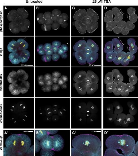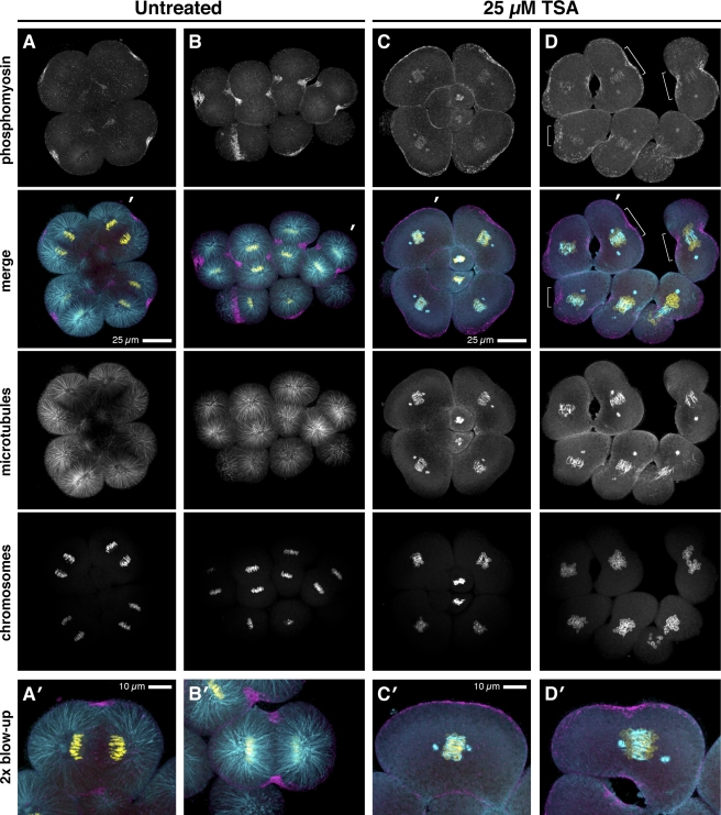 Figure 5. Myosin occupies a wider-than-normal zone in asterless cells. Cyan, anti-tubulin; yellow, Hoechst; magenta, anti-phospho-myosin. (A and B) Untreated 16-cell sand dollar embryos. Projection of 24 0.5-µm sections, vegetal view (A); and 19 0.6-µm sections, side view (B). (C and D) 16-cell sand dollar embryos fixed 10 min after adding 25 µM TSA. (C) A projection of 18 0.5-µm sections through the middle portion of the macromeres. (D) A projection of 28 0.5-µm sections through the middle portion of the mesomeres. A–D are from the same batch fixed at the same time. Normally, phospho-myosin is virtually absent outside of ∼10 µm furrow zone. In TSA-treated cells, phosphomyosin is not as thoroughly excluded from the poles but is still enriched equatorially, with definite zones around ingressing furrows (brackets in D), even though no spindle microtubules approach the cortex. A′–D′ are 2× enlarged views of the cells indicated by the white marks in A–D. |