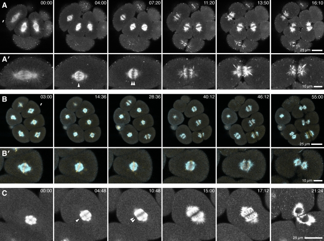 Figure 4. Cleavage occurs despite diminution of the aster and cortical microtubules by TSA. All panels are single confocal sections. (A) 16-cell purple urchin embryo (EMTB-3G), treated with 20 µM TSA at time 00:00. Aâ² shows a 2à enlarged view of the indicated cell (white mark in A). Within minutes of TSA addition in metaphase, asters were reduced to nearly nothing (04:00). Despite reduction in spindle length, cells enter anaphase (07:20) and complete cytokinesis (11:20â16:10). No microtubules connecting the mitotic apparatus to the cortex are visible (see Video 4). (B) 16-cell purple urchin embryo (cyan, EMTB-3G; yellow, mC-H2B); 15 µM TSA was added at time 00:00. After a delay in metaphase, five of six cells in focus initiate cytokinesis. Bâ² shows a 2à enlarged view of the indicated cell (white mark in B). (C) One cell within a 16-cell sand dollar embryo (EMTB-3G), treated with 25 µM TSA â¼10 min before time 00:00. Although the aster regrows slightly, the cortex is â¼20 µm away from the nearest spindle microtubule ends; nevertheless, cytokinesis completes accurately (see Video 4). Arrowheads in A and C indicate metaphase plate before (04:00 and 04:48), and the gap after (07:20 and 10:48), anaphase onset. Time is indicated in minutes:seconds. |