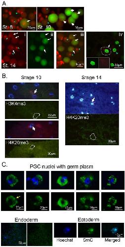 Fig. 5. Pre-neurula PGCs display permissive chromatin and histone staining. (A)ï Fluorescence stereomicroscopy of PGCs (green) and somatic cells from dissociated embryos. Cells were stained with anti-hyperacetylated Histone H4 (Penta, red), a marker of transcriptionally active chromatin. Stage 8 and 10 represent merged images of Penta immunostaining and DiOC6 labeling (green). Stage 14: (i) Penta alone, (ii) DiOC6, (iii) merged image, (iv) merged confocal image showing Penta staining (green) and a PGC (outlined) identified by Xnos1 (red) immunostaining. (insets show separate images). Examples of PGCs (white arrows) and endoderm cells (green arrowheads) with nuclear staining. Both PGCs and somatic cells express Histone H4 Penta at every stage. (B)ï Cryostat sections from stages 10 and 14 showing the endodermal region immunostained for H4K20me3 or H3K4me3 (green). PGCs indicated by Xnos1 immunostaining (red); nuclei stained with Hoechst (blue). PGCs (white arrows), other nuclei from endoderm cells. PGC nuclei are outlined. No nuclear staining was detected for any of the histone methylated lysines tested (see Materials and methods). (C)ï Stage 10 isolated PGC and endoderm nuclei (blue) immunostained for 5mC (green). Both cell types were demethylated on cytosine residues. DiOC6-stained germ plasm remained associated with PGC nuclei (arrow). 5mC staining of ectoderm nuclei served as a