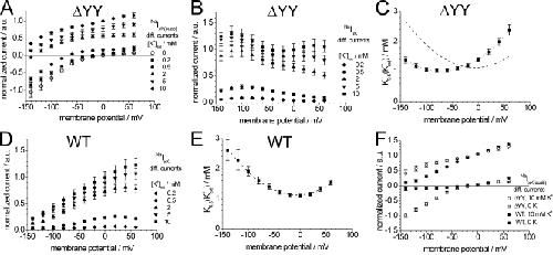 Figure 2. Voltage and [K+]ext dependence of stationary currents at [Na+]ext = 100 mM. (A) I-V curves of normalized ouabain-sensitive K+-dependent currents NaIxK(ouab) of the Na+/K+-ATPase ÎYY deletion construct measured at 100 mM [Na+]ext and [K+]ext as indicated. (B) I-V curves of normalized K+-induced difference currents NaIxK (at 100 mM [Na+]ext) of the ÎYY construct. (C) Voltage-dependent NaK0.5(K+ext) values of the ÎYY construct from fits of a Hill function to the NaIxK currents in B at each membrane potential. The minimal NaK0.5(K+ext) was 1.02 ± 0.06 mM at â80 mV. The dashed line delineates the corresponding WT data from E for comparison. (D) I-V curves of normalized NaIxK difference currents for ATP1A2 WT with [K+]ext as indicated. (E) Voltage-dependent NaK0.5(K+ext) values for ATP1A2 WT from fits of a Hill function to the NaIxK currents in D at each membrane potential. The minimal NaK0.5(K+ext) was 1.10 ± 0.05 mM at 0 mV. Data for both WT and ÎYY are means ± SE from 14 cells of three oocyte batches. (F) I-V curves of normalized NaI10K(ouab) and NaI0K(ouab) currents of ATP1A2 WT and the ÎYY construct at pHext 7.4 ([Na+]ext = 100 mM). Data are means ± SE from six (WT) and seven (ÎYY) cells from two batches.