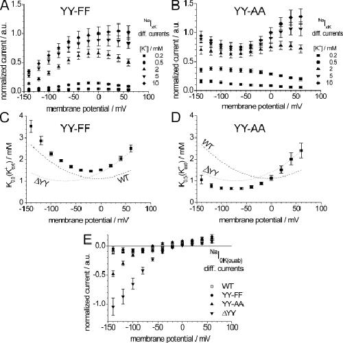 Figure 6. Properties of stationary currents of ATP1A2 mutants YY-FF and YY-AA. (A and B) Normalized I-V curves for NaIxK currents of ATP1A2 mutants YY-FF (A) and YY-AA (B), with [K+]ext as indicated ([Na+]ext = 100 mM, pH 7.4). (C and D) NaK0.5(K+ext) values from NaIxK currents for mutant YY-FF (C) and YY-AA (D) from fits of a Hill function to the data in A and B at each membrane potential. The corresponding WT data from Fig. 2 E (dashed lines in C and D) and ÎYY data from Fig. 2 C (dotted lines in C and D) are superimposed. (E) I-V curves of normalized ouabain-sensitive NaI(ouab) currents ([Na+]ext = 100 mM and [K+]ext = 0, pH 7.4) for ATP1A2 WT and mutants YY-FF, YY-AA, and ÎYY. Data are means ± SE of 10â14 cells from three batches.