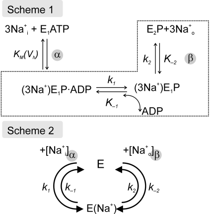Figure 8. Partial reaction schemes for the Na+ transport limb of the Na+/K+-ATPase cycle. Scheme 1 was introduced by Holmgren and Rakowski (2006) to describe the dependence of Na+/K+-ATPase presteady-state currents on intracellular [Na+]. At saturating intracellular concentrations of Na+ and ATP, the intracellular Na+ binding (and phosphorylation) is at rapid equilibrium, and the subsequent slow occlusion step kinetically isolates the intracellular Na+ binding step from the more rapid extracellular Na+ release steps. Scheme 2 refers to Vasilyev et al. (2004), who provided a concept for the mainly H+-driven inward currents of the Na+/K+-ATPase observed in Na+- and K+-free extracellular solutions. At low pHext, the energy barrier for equilibration of occluded Na+ ions with the intracellular space is reduced so that the occluded state can be reached from the extracellular as well as the intracellular solution. See Appendix for details.