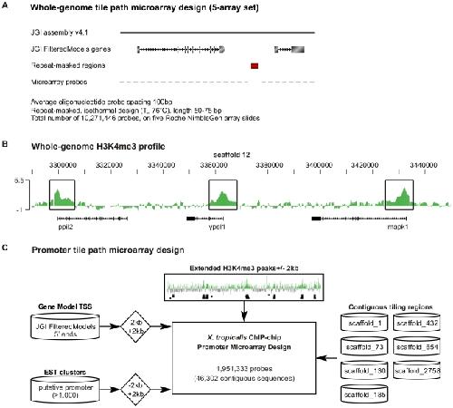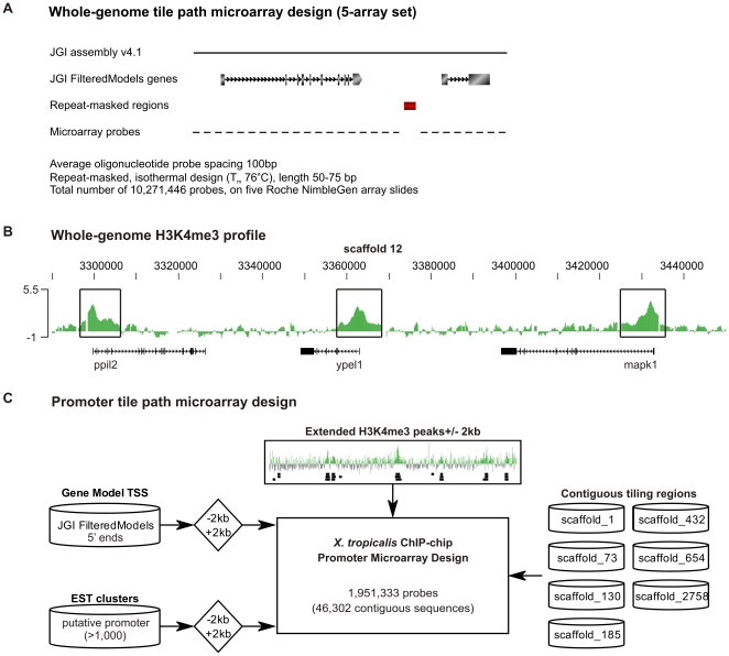Chromatin immunoprecipitation combined with genome tile path microarrays or deep sequencing can be used to study genome-wide epigenetic profiles and the transcription factor binding repertoire. Although well studied in a variety of cell lines, these genome-wide profiles have so far been little explored in vertebrate embryos. Here we report on two genome tile path ChIP-chip designs for interrogating the Xenopus tropicalis genome. In particular, a whole-genome microarray design was used to identify active promoters by close proximity to histone H3 lysine 4 trimethylation. A second microarray design features these experimentally derived promoter regions in addition to currently annotated 5' ends of genes. These regions truly represent promoters as shown by binding of TBP, a key transcription initiation factor. A whole-genome and a promoter tile path microarray design was developed. Both designs can be used to study epigenetic phenomena and transcription factor binding in developing Xenopus embryos.