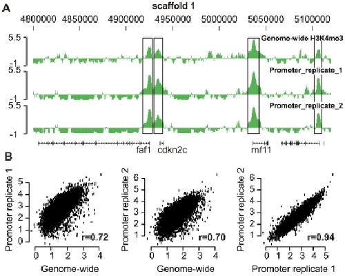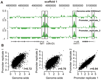 Figure 2. Promoter microarray H3K4me3 ChIP-chip.(A) Part of scaffold_1 is visualized using the UCSC Genome Browser. The four H3K4me3 enriched regions; Fas associated factor 1 (faf1), cyclin-dependent kinase inhibitor 2C (cdkn2c), ring finger protein 11 (rnf11) and an unknown protein are preserved in the three independent experiments. (B) Correlation of the genome-wide tiling and promoter microarray design ChIP-chip experiments; Pearson correlation r = 0.72, 0.70 and 0.94 respectively (p<2.2 * 10−16).