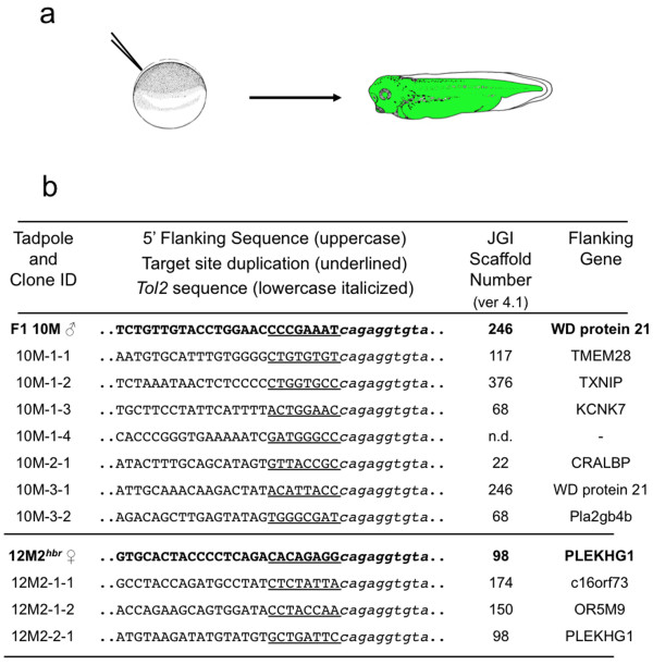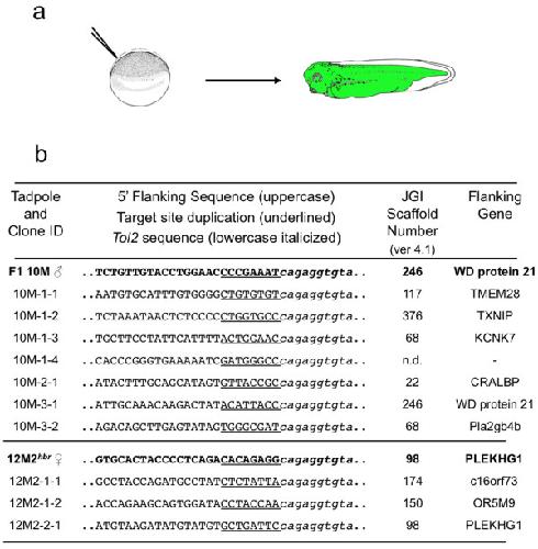 Figure 1. Somatic remobilization of a single copy Tol2 transposon in Xenopus tropicalis. (a) Schematic of the micro-injection remobilization strategy. Embryos were injected with synthetic Tol2 transposase mRNA at the one-cell stage and allowed to develop to swimming tadpole stage before genomic DNA was harvested for analysis of the integration sites by EPTS LM-PCR. (b) Sequence of the Tol2 integration sites identified in the 'remobilized' tadpoles. Two independent single transposon integration sites (10M and 12M) were used to demonstrate somatic remobilization of Tol2 transposons in Xenopus tropicalis. The parental integration sites are shown in bold. Examples of novel re-integration sites, indicating remobilization of the parental transposon, are listed below the parental site and are labelled to identify the tadpole and clone number (for example, 10M-tadpole number-clone number). Multiple remobilization events could be identified in individual tadpoles, tadpole 10M-1 had four novel integration events, suggesting that multiple independent remobilizations had occurred in discrete blastomeres during early development. All tadpoles analyzed (18/18 = 100%) had at least one novel re-integration event. The parental transposon could be remobilized from either male or female Tol2XIG F1 transgenic donor animals. The genomic sequence flanking the 5'-end of the transposon is shown in capital letters and the eight base pair target site duplication (TSD) is underlined. The transposon sequence in depicted by lower case italics text. The transposon flanking sequences were compared to the Xenopus tropicalis genome sequence (JGI assembly v4.1) to identify the scaffold identity of the integration site and to identify flanking genes; the gene nearest to the transposition site is listed in the table. |