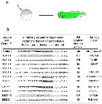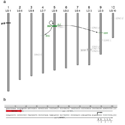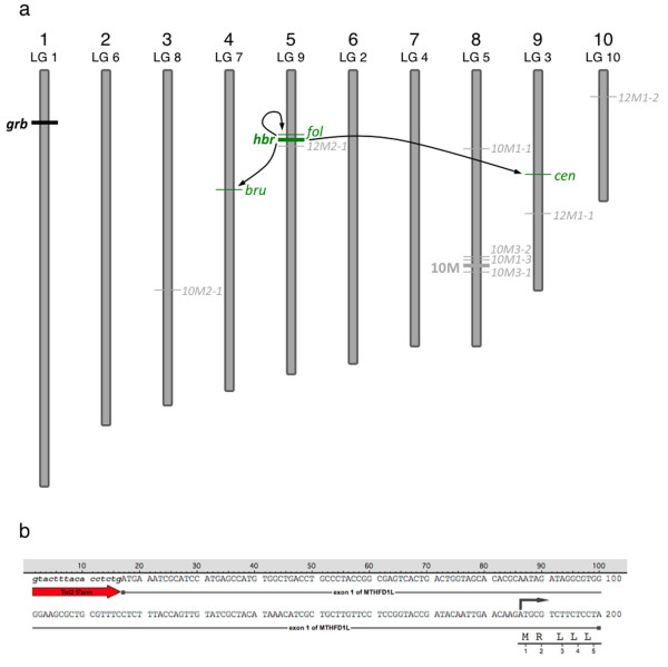 Figure 5. Chromosome map of Tol2 transposon insertions transmitted through the germline. (a) Schematic representation of Xenopus tropicalis chromosomes and the relative location of the Tol2 integration sites (not to scale). Chromosomal assignments were predicted using the scaffold identity revealed by comparison of the transposon flanking sequence with the Xenopus tropicalis genome sequence (JGI v4.1 assembly). The position of the Tol2 integration on each chromosome was estimated from the map position of the corresponding scaffold. The parental integration site, hbr used for the germline remobilization experiment, is depicted by the thick green line and is labeled on the left side of the chromosome. Examples of remobilized transposition events that are passed through the germline are in green and are labeled on the right hand side of the corresponding chromosome. Mapping the integration sites provided evidence for both 'local hopping' and random re-integration throughout the genome. Remobilization events are indicated by the arrows. (b) Sequence analysis of the EPTS LM-PCR product from the fol allele reveals integration of the Tol2XIG transposon at the beginning of the first exon of the MTHFD1L gene. The sequence of the 5'-end of Tol2XIG is in lowercase italics and represented by the red arrow. The integration event has occurred at the first nucleotide of exon 1 (uppercase text) of the MTHFD1L gene, 169 bp upstream of the translation start codon, depicted by the dark arrow above the sequence. The first five amino acids of the MTHFD1L gene are shown in single letter code below the corresponding codons. |