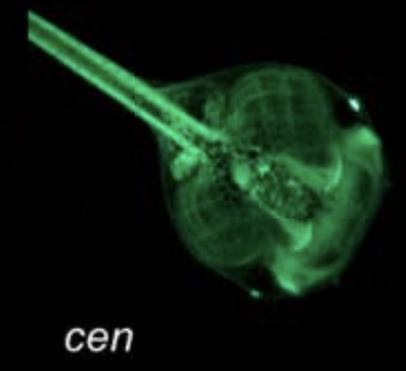 Representative GFP expression patterns from NF stage 48 tadpole with novel transposon insertion sites called centaure (cen). tadpole in dorsal view, with anterior facing towards the lower right corner. |