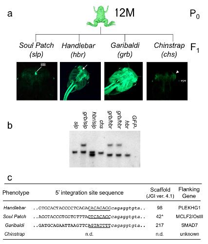 Additional file 2. Supplemental Figure S1 - The 12M founder has four independently-segregating Tol2XIG transposons each with a unique GFP expression pattern. Outcross of the 12M founder resulted in the segregation of four independent Tol2XIG alleles and revealed unique GFP expression patterns associated with each integration event. (a) Schematic representation of the outcross of founder 12M to yield tadpoles with individual expression patterns. The individual patterns were named Soul Patch (slp), Handlebar (hbr), Garibaldi (grb) and Chinstrap (chs). Tadpoles were photographed at stage 51 and the figures are oriented with anterior towards the top of the panel. The intense GFP expression in the slp embryo in the basihyal basibranchial cartilage is labelled BB. The bright GFP expression in the leading edge of the hbr tadpole is indicated by the white arrow. The white arrowhead in the chs panel points to the GFP expression in the lower jaw of the tadpole. The eye is labelled in this panel to guide the reader. (b) Southern blot analysis of F1 tadpoles harbouring different combinations of the four transposons in founder 12M. Genomic DNA from individual tadpoles was digested with BglII and the resulting Southern blot was probed with a GFP probe. (c) EPTS LM-PCR was used to clone the genomic sequences flanking the transposon insertion sites in three of the four 12M alleles. The genomic DNA sequence flanking the transposon is indicated by the capitalized text and the sequence of the 5' end of Tol2XIG is shown in lowercase italics. |
