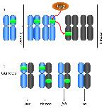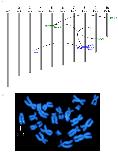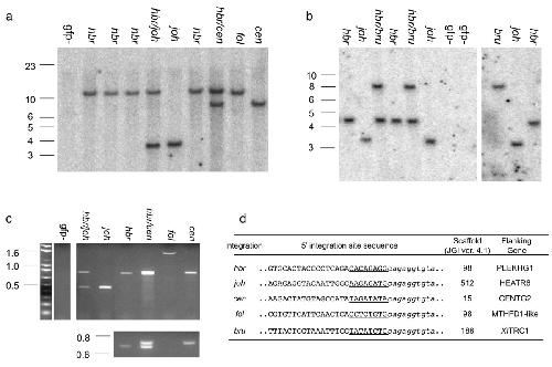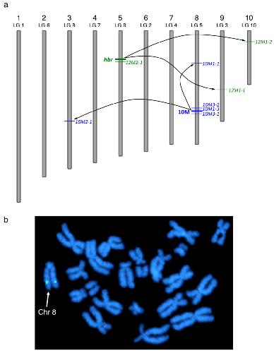 Figure 2. Chromosomal location of Tol2 transposon insertions in the Xenopus tropicalis genome. (a) Schematic representation of Xenopus tropicalis chromosomes and the relative location of the Tol2 integration sites (not to scale). Chromosomal assignments were predicted using the scaffold identity revealed by comparison of the transposon flanking sequence with the Xenopus tropicalis genome sequence (JGI v4.1 assembly). The position of the Tol2 integration on each chromosome was estimated from the map position of the corresponding scaffold. The parental integration sites (10M and 12M (hbr)) used for somatic remobilization are depicted by the thick lines and are labeled on the left side of the chromosome. Examples of remobilized somatic transposition events listed in Figure 1b are labelled on the right hand side of the chromosome. Mapping the integration sites provided evidence for both 'local hopping' and random re-integration throughout the genome. (b) Fluorescent in situ hybridization (FISH) analysis of the 10M line confirms the location of the Tol2XIG transposon on the long arm of chromosome 8 (linkage group 5). Metaphase spreads prepared from heterozygous 10M tadpoles were hybridized with a digoxigenin-labeled GFP probe and counterstained with DAPI. |
