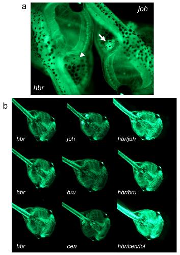Figure 3. Remobilized Tol2 transposons are transmitted through the germline and result in novel GFP expression patterns. Fluorescent photomicrographs of sibling GFP-positive tadpoles from the outcross of remobilized frog 12M2♀5. (a) The parental integration pattern (hbr) is shown in the tadpole on the left (anterior facing upper left) and the novel GFP expression pattern is shown on the right (jovan heat, joh; anterior facing lower right). The tadpoles were oriented to juxtapose the kidneys for comparison of the different levels of GFP expression in the kidneys of the two lines. Note the intense GFP expression in the kidney of the joh tadpole (white arrow) compared to the kidney of the hbr tadpole (white arrowhead). (b) Representative GFP expression patterns from the outcross of 12M2♀5. Left column shows tadpoles (stage 48) with the parental (hbr) GFP expression pattern. Four novel transposon insertion sites were identified in the progeny of 12M2♀5 and were named jovan heat (joh), brut (bru), centaure (cen) and follique (fol). Each of the novel integration events has a subtle difference in the resulting GFP expression pattern. All tadpoles are oriented with the anterior facing towards the lower right corner of each panel. |