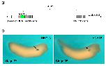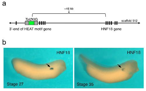 Additional file 4. The jovan heat (joh) allele has a Tol2XIG transposon integrated near the HNF1β gene (a) Schematic representation of the Tol2XIG integration event in joh (not to scale). The transposition reaction resulted in integration of the transposon in intron 9 of a novel HEAT motif-containing gene on scaffold 512:565147. In situ hybridization with antisense RNA probes generated to the HEAT repeat cDNA indicated low-level ubiquitous expression of the HEAT motif-containing gene that lacked robust expression in the developing kidney (data not shown). The HNF1β gene flanks the 3' end of the HEAT motif-containing gene and is approximately 46 kb from the Tol2XIG transposon. (b) In situ hybridization for HNF1β expression during Xenopus development shows intense staining in the developing kidney [47]. Antisense RNA probes were synthesized from a Xenopus laevis HNF1β cDNA (IMAGE 4959359). In situ stained albino Xenopus laevis embryos shown at stages 27 and 35 (anterior is facing to the right, dorsal up). Arrows point to the developing kidney. |