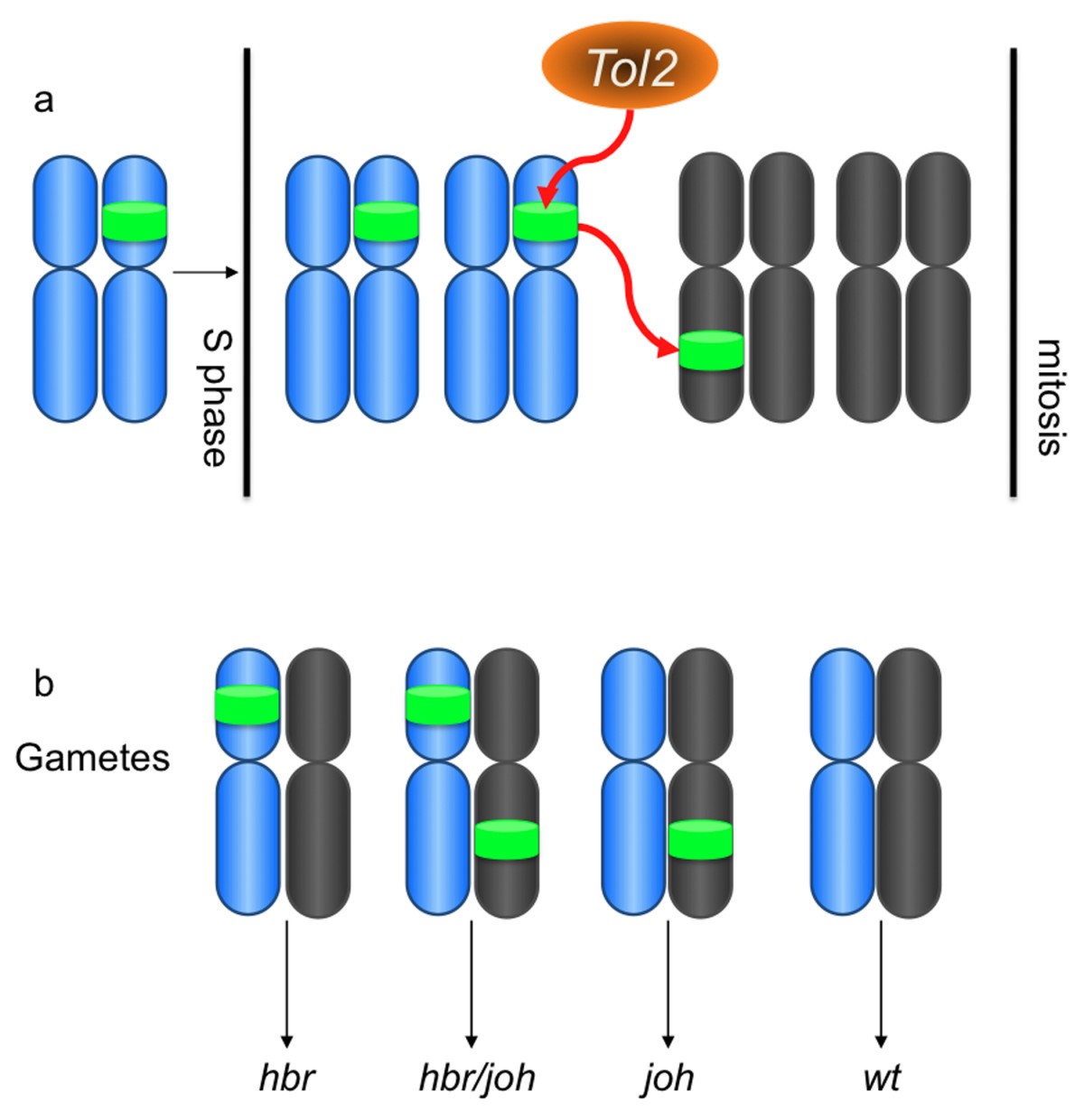 Figure 7. Proposed mechanism for the increase in the number of transposons following injection-mediated Tol2 remobilization. One-cell embryos harvested from an outcross of 12M2, with a single transposon integration (hbr), were injected with Tol2 mRNA. GFP-positive tadpoles were raised to adulthood and outcrossed to identify germline transmission of the remobilized transposon. Analysis of progeny from remobilized frog 12M2â5 indicated that many of the offspring had inherited multiple copies of the Tol2XIG transposon. The Tol2 transposase uses a simple 'cut-and-paste' transposition mechanism and the apparent increase in transposon content in the progeny was unexpected. The likely explanation for the increase in number of Tol2 transposons is the remobilization of the substrate following DNA replication, but prior to mitosis (reviewed in [42]), in the blastomeres in the early embryo. DNA replication (S phase) results in two copies of the Tol2 substrate in each cell and one, or both, copies can be remobilized by the injected Tol2 transposase enzyme. During mitosis the transposon alleles are randomly segregated into the daughter cells. In the example depicted in the cartoon (a), the resident Tol2 transposon on the hypothetical blue chromosome is replicated during S phase and one copy is remobilized by the Tol2 transposase to a new location on a hypothetical grey chromosome. If the targeted blastomere gives rise to a germ cell, then the resulting gametes may contain different combinations of the transposon alleles (b) and the resulting tadpoles may have one or both of the integration events. |