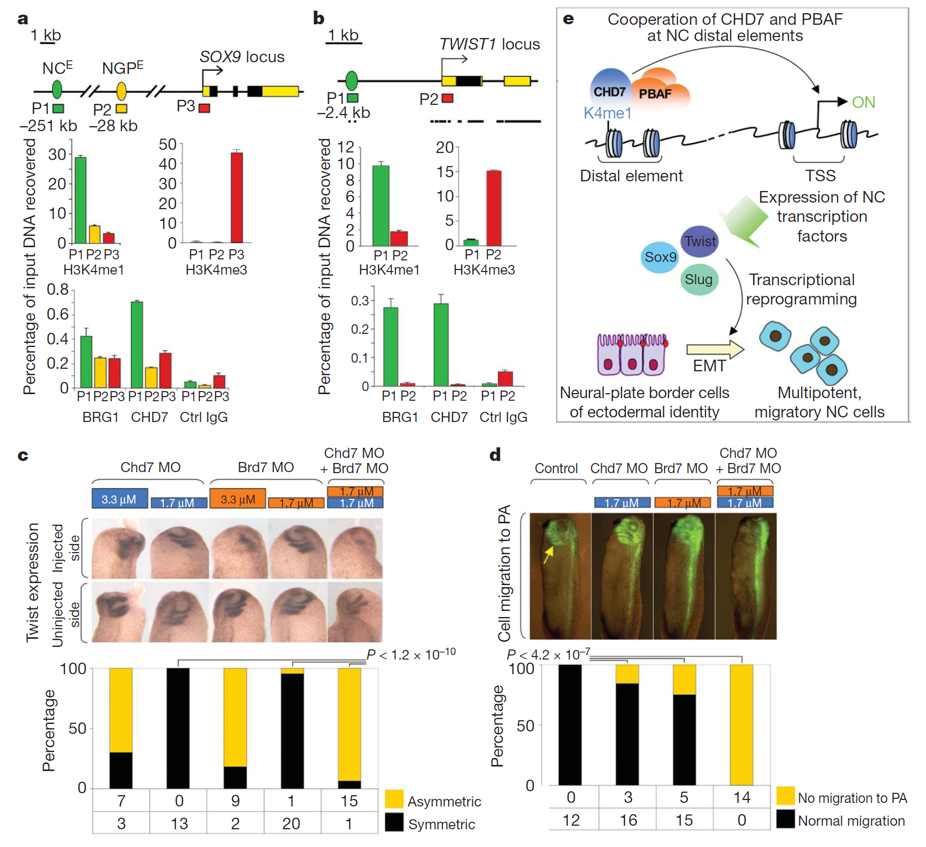 Figure 4. CHD7 and PBAF bind distal regulatory elements upstream of NC transcription factors and synergistically regulate NC gene expression and migration in vivo. a, In hNCLCs CHD7 and BRG1 co-occupy the NCspecific distal enhancer controlling SOX9 expression. Top: schematic representation of the SOX9 locus, showing the relative positions of primer sets (P1–P3) used for ChIP–quantitative polymerase chain reaction (qPCR) analyses, NC-specific (NCE) and notochord, gut and pancreas-specific (NGPE) SOX9 distal enhancers, as identified in ref. 9. Bottom: ChIP–qPCR analyses of H3K4me1, H3K4me3, CHD7 and BRG1 levels at P1–P3 genomic regions in hNCLCs. b, In hNCLCs CHD7 and BRG1 co-occupy a conserved distal element located upstream from the TWIST1 TSS. Top: schematic representation of the TWIST1 locus, showing the relative positions of primer sets (P1 and P2) used for ChIP–qPCR analyses. The conservation index for 31 eutherian mammals (ENSEMBL) is shown below. Bottom: ChIP–qPCR analyses of H3K4me1, H3K4me3, CHD7 and BRG1 levels at P1 and P2 genomic regions. In a and b the y axes show the percentage of input recovery; error bars represent s.d. from three technical replicates of a representative experiment. Ctrl, control. c, Synergistic effect of Chd7 and Brd7 MOs on Twist expression. Twist in situ hybridization analyses of early-tailbud embryos injected with the indicated doses of Chd7 and/or Brd7 MOs into a single DA blastomere at the eight-cell stage. All injection volumes were kept constant. Representative images of the injected (top) and uninjected (bottom) side of the same embryo are shown. Asymmetry in Twist expression is quantified in the bottom graph. d, Synthetic effect of Chd7 and Brd7 MOs on NC migration. Analysis of cell migration to pharyngeal arches in tadpoles derived from eight-cell stage embryos co-injected with fluorescent lineage tracer and indicated MOs into a single DA blastomere. Quantification of cell migration to pharyngeal arches (PA) is shown in the bottom graph. P values in c and d were calculated by Fisher’s exact test for count data. e, Model of CHD7 function in neural crest formation. We propose that CHD7 and PBAF synergistically, and in a tissue-specificmanner, regulate activity of distal elements controlling expression of critical NC transcription factors. Activation of NC transcriptional circuitry in turn permits gene expression reprogramming, leading to epithelial–mesenchymal transition (EMT), acquisition of multipotency and migratory potential.