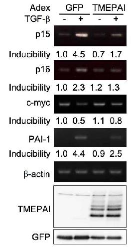 Figure S4. Ectopic Expression of TMEPAI Inhibits TGF-β-Induced Expression of p15, p16, and PAI-1 and Downregulation of c-myc Expression HaCaT cells infected with TMEPAI- or GFP-expressing adenoviruses were stimulated with 0.5 ng/ml TGF-β for 4 h before total RNAs were prepared. The expressions of TMEPAI and GFP in total lysates were detected with anti-V5 (6th panel) and anti-GFP monoclonal antibodies (SantaCruz) (bottom panel). The expressions of p15, p16, c-myc and PAI-1 were measured by semi-quantitative RT-PCR and normalized using the intensity of the band corresponding to β-actin. The level of induction was calculated relative to the value for GFP-infected cells in the absence of TGF-β |