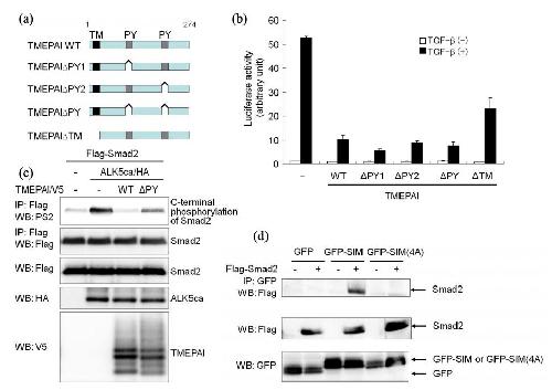 Figure S7. Contribution of PY Motifs and SIM Domain in TMEPAI for TGF-β Signaling (a) Schematic presentation of TMEPAI mutants lacking PY motifs or transmembrane domain. TM; transmembrane domain, PY; PY motif. (b) PY and TM motifs of TMEPAI are dispensable for its inhibitory effect on TGF-β-induced Smad dependent transcriptional response. TMEPAI and its mutants were co-transfected with (CAGA)12-luc in Mv1Lu cells with or without 5 ng/ml TGF-β for 18 h. (c) TMEPAIÎPY affects ALK5ca-induced Smad2 phosphorylation, albeit less efficiently than wild-type TMEPAI. COS7 cells were transfected with indicated plasmids. To show phosphorylation of Smad2 upon ALK5 activation, the cell lysates were immunoprecipitated with anti-Flag M5 antibody, and then analyzed by western blotting with PS2. (d) SIM domain is required for TMEPAI to bind to Smad2. COS7 cells were transfected with indicated plasmids. The cell lysates were immunoprecipitated with anti-GFP antibody (Wako), and then analyzed by western blotting with anti-Flag M5 antibody. For western blotting, anti-GFP antibody was used. GFP-SIM was constructed by introduction of the SIM in TMEPAI (Cys157 to Ile206) into pEGFP-C3. GFP-SIM(4A) was made by the introduction of four serious alanines instead of P178PNR181 as described in Fig. 3e. |